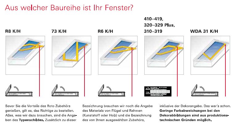 Nicht passend für ältere ROTO-Dachfenster der Baureihen 410/417 oder H1 bzw. H3. Für diese Fenster können wir noch Zubehör auf Anfrage anbieten!