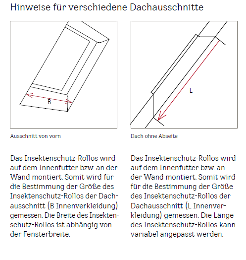 Hinweis: Das Insektenschutz-Rollo wird auf die Innenverkleidung des Fensters montiert, so dass es mit der Wand bündig ist. Die notwendige Größe kann durch Messen des Dachausschnittes bestimmt werden. Beachten Sie, dass die Breite des Rollos gegeben ist, während die Länge bei Bedarf gekürzt werden kann.